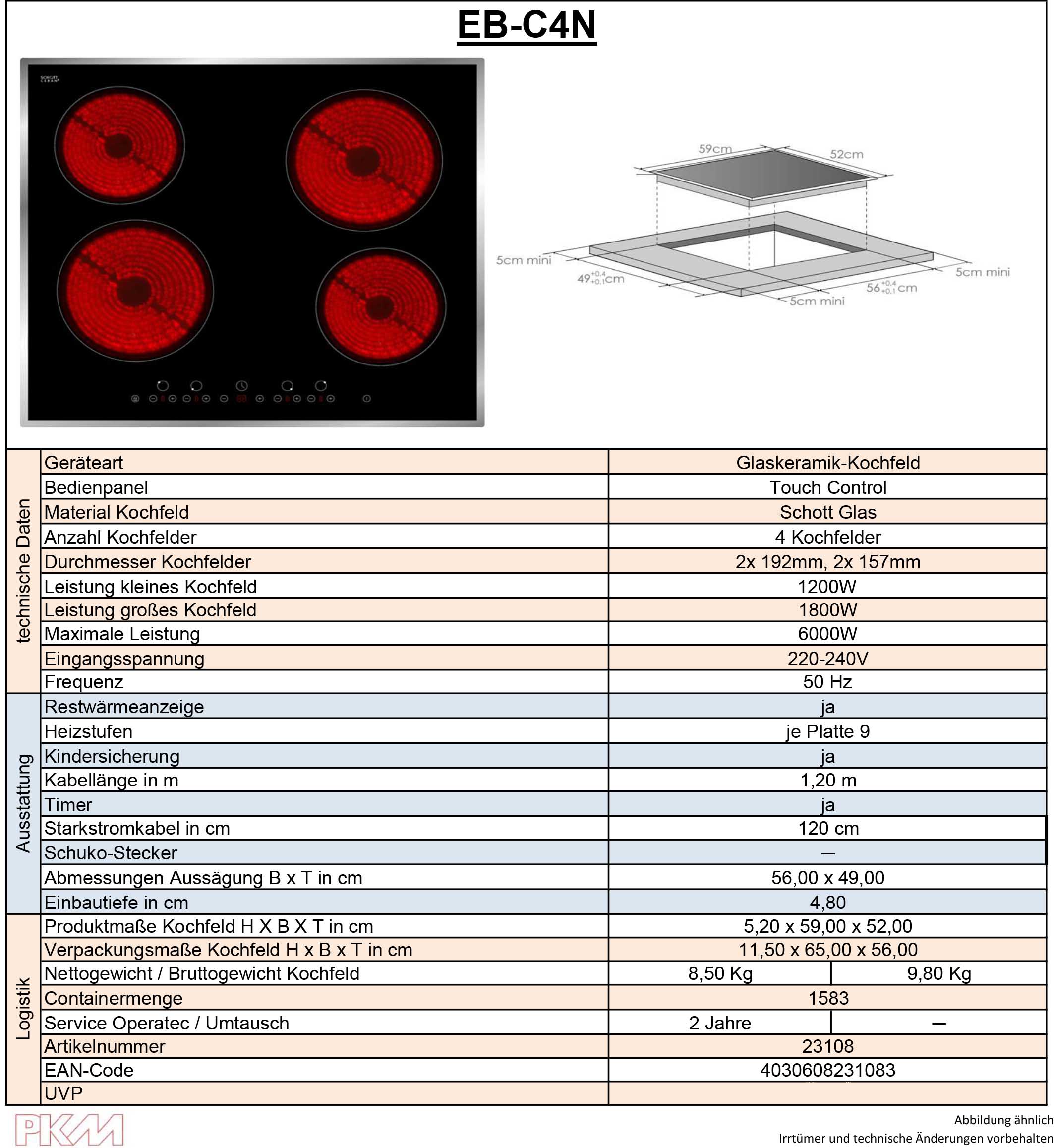 - 4 Kochfelder, 17 Heizstufen pro Kochfeld, Sensorbedienung