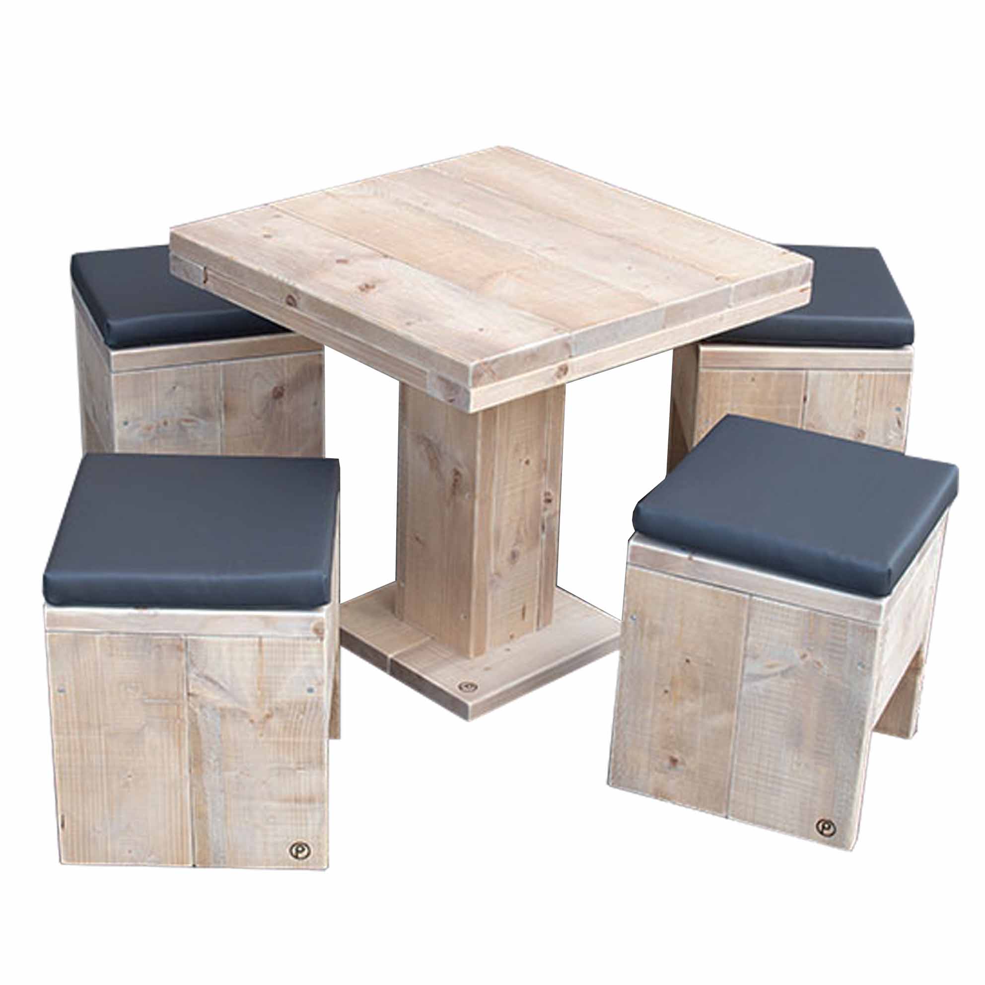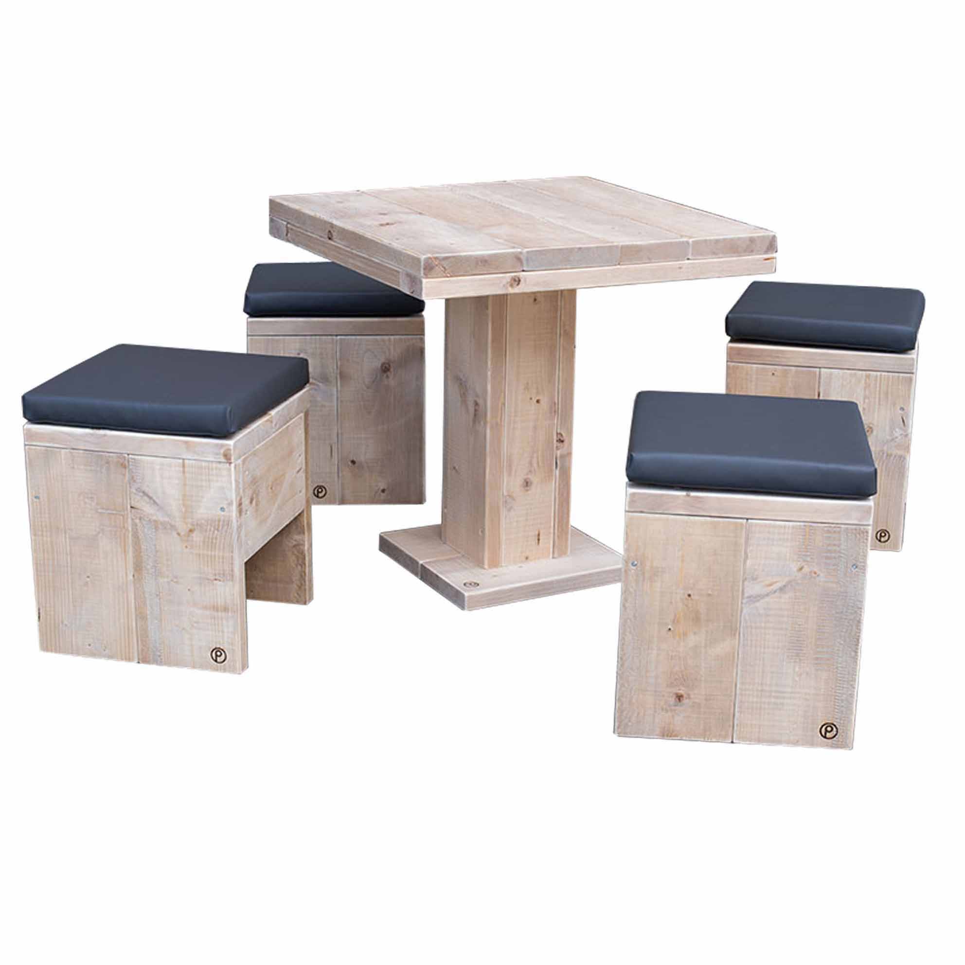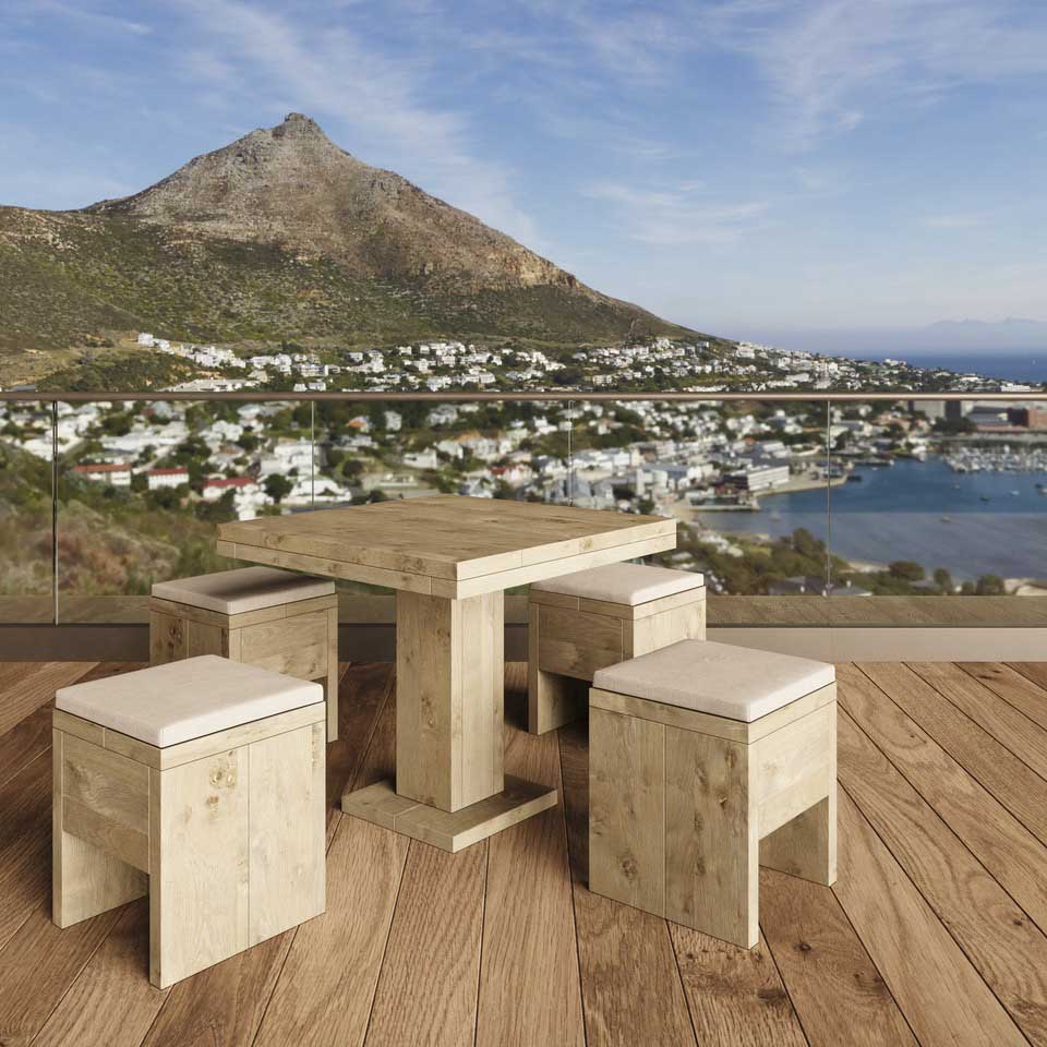 Bauholz Möbel: Esstisch mit 4 passenden Hockern (incl. Polster) aus Neuholz in typischem Bauholz Look