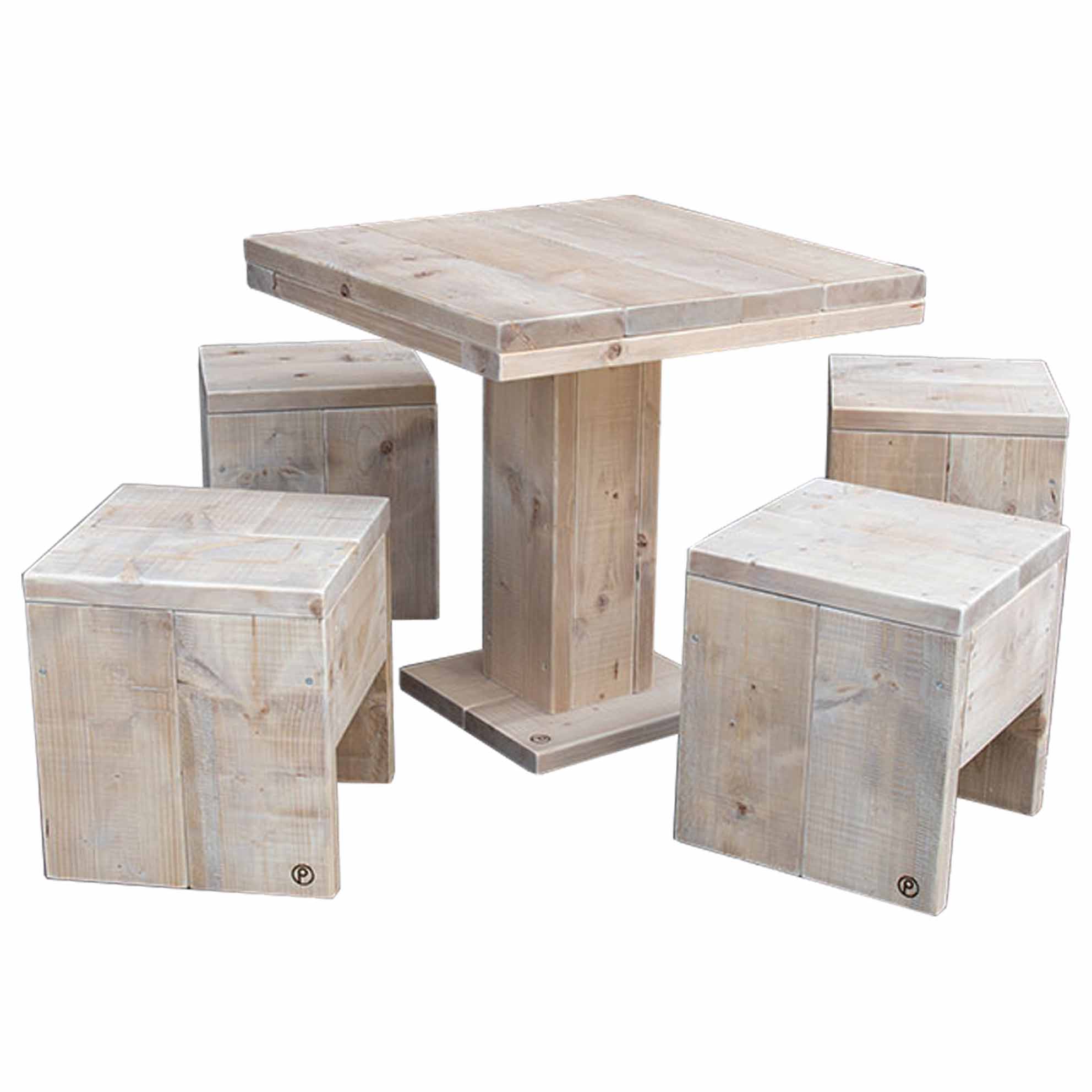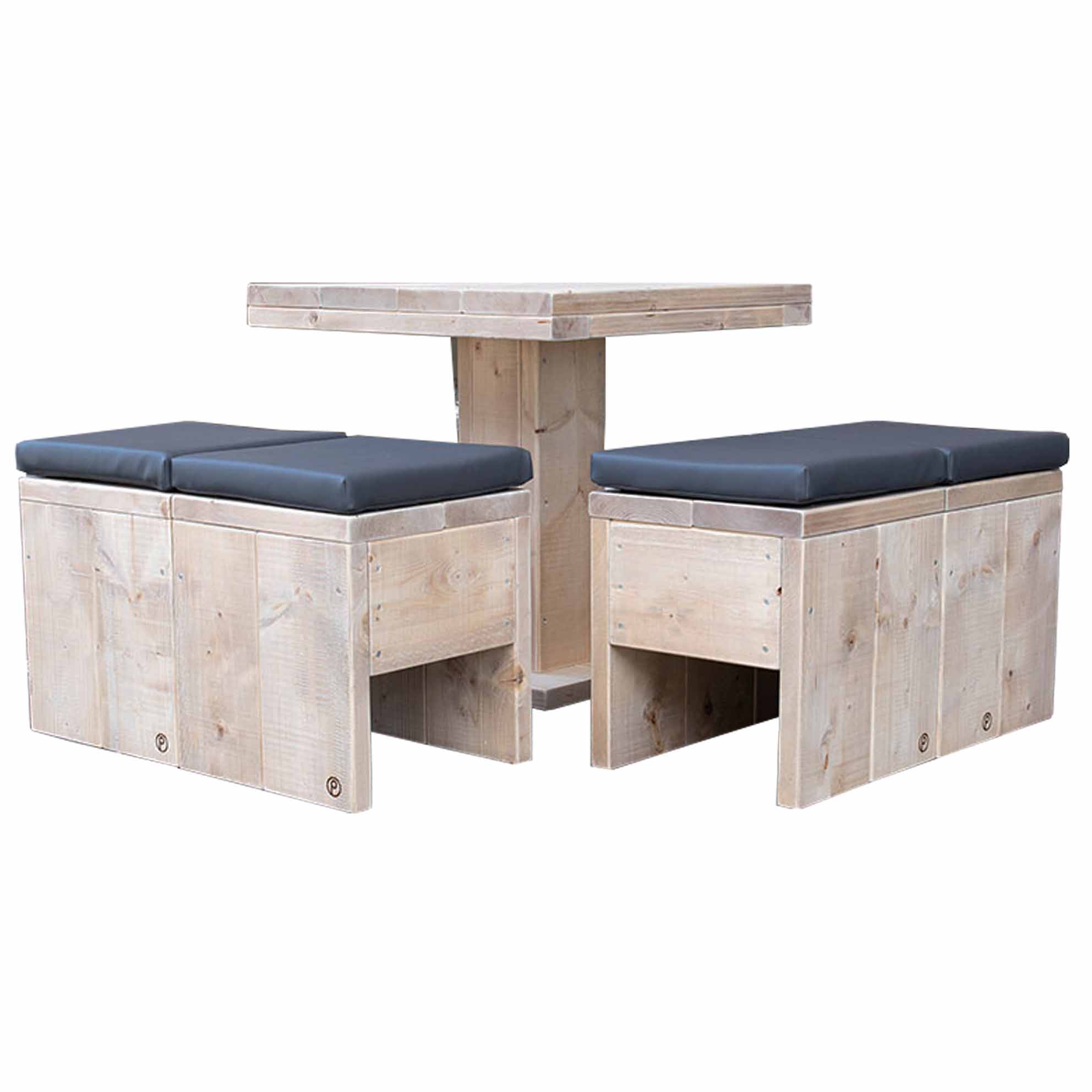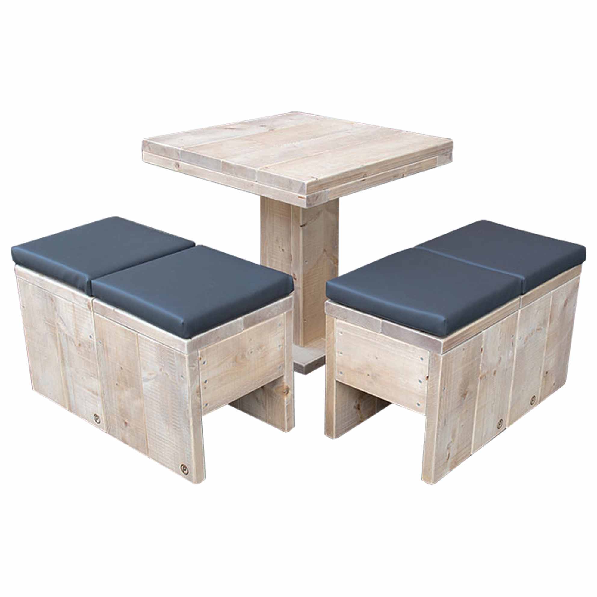 Bauholz Möbel: Esstisch mit 4 passenden Hockern (incl. Polster) aus Neuholz in typischem Bauholz Look