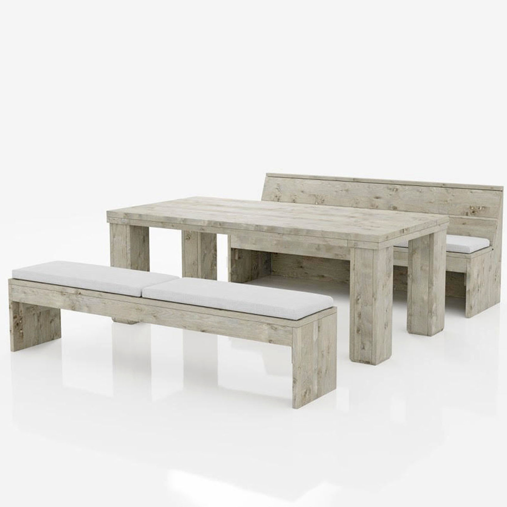Bauholz Möbel: Esstisch mit 2 Bänken aus Neuholz in typischem Bauholz Design