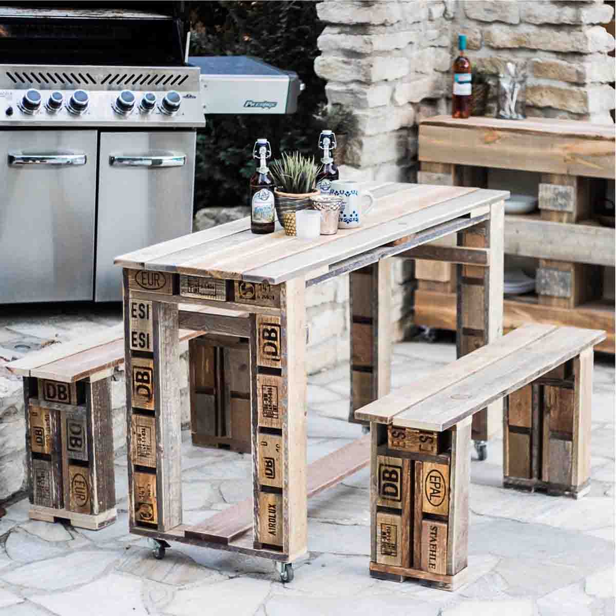 Palettenmöbel - Hochtisch auf Rollen mit 2 ausklappbaren Sitzgelegenheiten Ob im privaten Garten, auf Messen oder in der Gastronomie, dieses Schmuckstück hat schon viele Freunde gefunden. Einfach eine geniale Idee und Konstruktion, dieses Möbelstück im klassischen Paletten Look. Sitze liegen im geschlossenen Zustand platzsparend am Tisch an und sind mit 2 Scharnieren fixiertMaße: Breite = 80cmHöhe = 86cmTiefe = 80cm Gewicht: 34kg Belastbarkeit gesamt: 130kg Belastbarkeit Sitz: 100kgMaße und Gewicht können materialbedingt leicht abweichen Material: Neuholz Kiefer / Fichte, Standard Auslieferung in Vintage gebeiztunbehandelt natur gerne auf Anfrage)Auf Wusch auch mit neutralen Klötzen ohne Branding Lieferzustand:Originalverpackt & Neu Artikel wird fertig montiert geliefert (Ausnahme: Rollen liegen transportbedingt bei)Deko-Artikel im Lieferumfang nicht enthalten Versand: Versandkosten (nach Volumen / Gewicht) sind im jeweiligen Warenkorb ersichtlich Versand auf Inseln und ins Ausland nur auf Anfrage