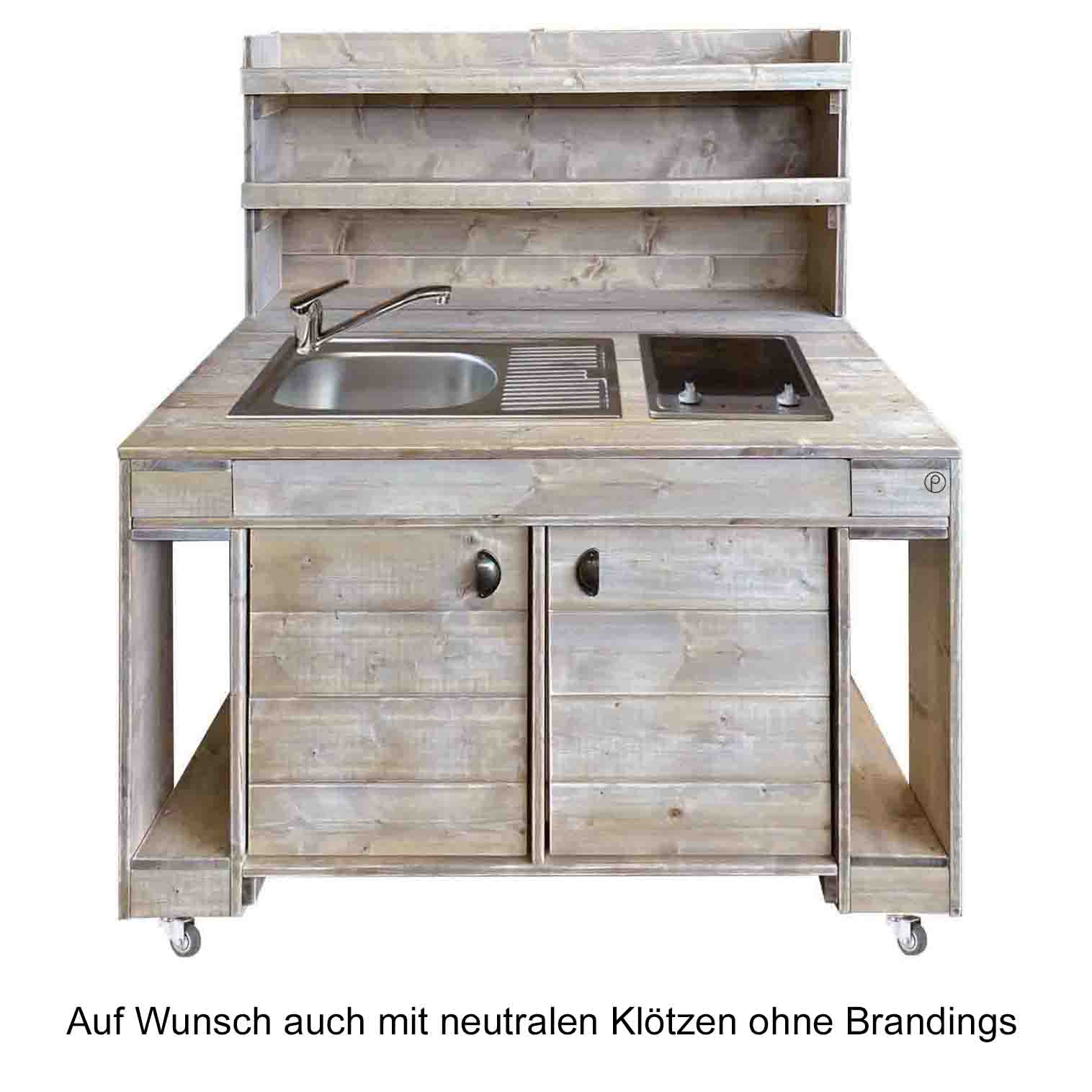 Grilltisch - Kücheninsel - Grillwagen - Outdoorküche im typischen Palettenmöbel Design Dieser funktionelle Grilltisch aus Neuholz lässt jedes Grillmeister-Herz höher schlagen.Sie werden Ihre Freude an diesem Grilltisch im Paletten Look haben, egal ob auf Terrasse, Balkon oder Garten. Viele praktische Detailsmachen diesen Palettentisch zu einem echten Schmuckstück.Die in die Tischplatte eingelassene Arbeitsfläche aus Feinsteinzeug erlaubt eine leichte Reinigung.4 seitliche Ablagen mit Rahmen sowie eine mittige Ablage schaffen reichlich Platz für Saucen, Gewürze oder Zubehör. 2 Schubladen bieten zusätzlichen Stauraum.Ausgestattet mit 4 Schwerlast-Rollen (2 davon mit Stopp-Funktion) wird dieser Palettenmöbel Grilltisch auch zum Grillwagen, und last sich mühelos an den gewünschten Standort transportieren.Varianten: "PREMIUM" mit Feinsteinzeug Einlage "PREMIUM" mit Edelstahl Arbeitsfläche "PREMIUM" mit Rückwand Regal u. Feinsteinzeug Einlage "PREMIUM" mit Rückwand Regal u. Arbeitsfläche Edelstahl Maße: Breite: 120 cm Tiefe: 80 cm Höhe: 91 cm (incl. Rollen) Gewicht: 63 KgMaße, Gewicht und Farbgebung können materialbedingt minimal abweichen Material: Neuholz Kiefer / Fichte, Standard Auslieferung in Vintage gebeizt unbehandelt natur gerne auf AnfrageTischplatte: 3-Schichten Tischlerplatte mit Bootslack eingelassenAuf Wunsch auch mit neutralen Klötzen ohne Branding Eigenschaften: Massiv gebauter Grilltisch / Grillwagen 2 Schubladen mit Muschelgriff 1 mittiges Abstellfach 83,5 x 80 cm, seitlich je 2 Abstellfächer mit Rahmen 2 Doppelhakenleisten Edelstahl 4 Schwerlastrollen (davon 2 mit Feststeller)OPTIONAL: passgenaue Abdeckhaube (siehe Zubehör)Lieferzustand: Originalverpackt & Neu Artikel wird fertig montiert geliefert (Ausnahme: Rollen und Doppelhakenleiste) Dekorationen im Lieferumfang nicht enthaltenVersand: Versandkosten (nach Volumen / Gewicht) sind im jeweiligen Warenkorb ersichtlich Versand auf Inseln und ins Ausland nur auf Anfrage