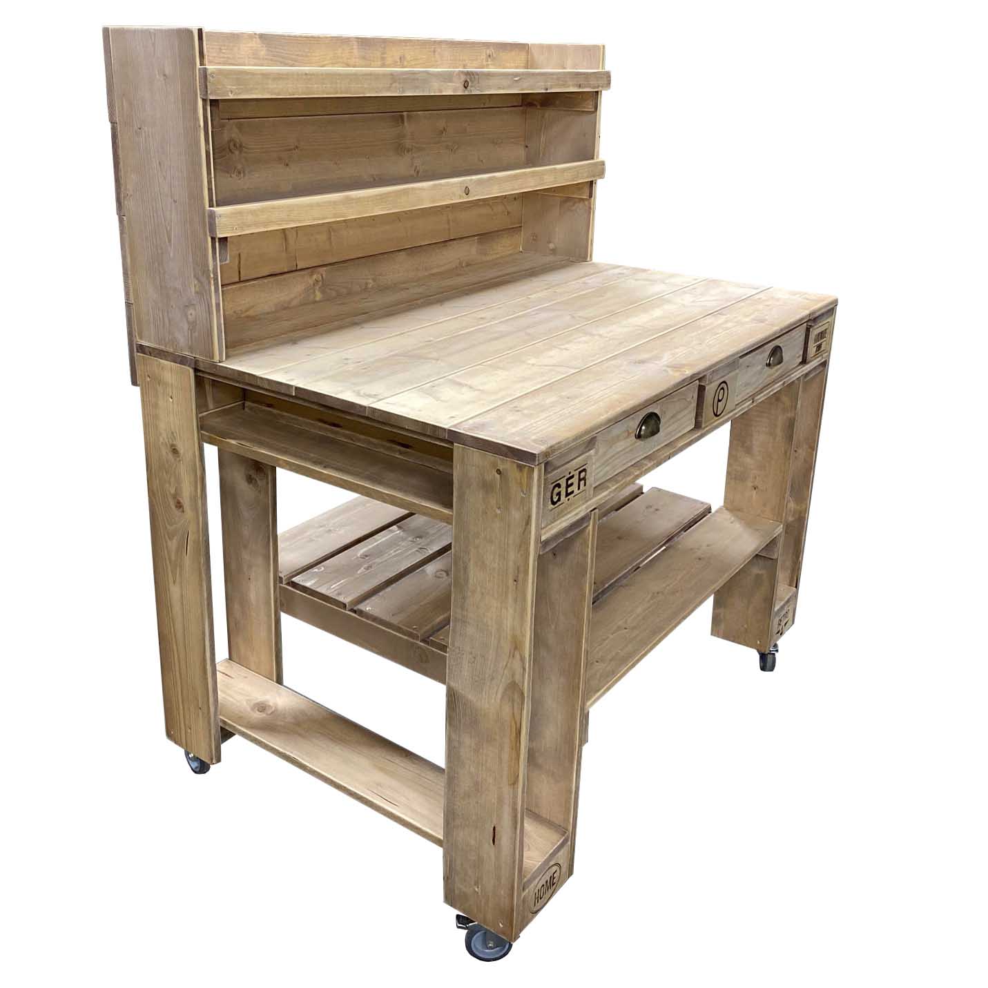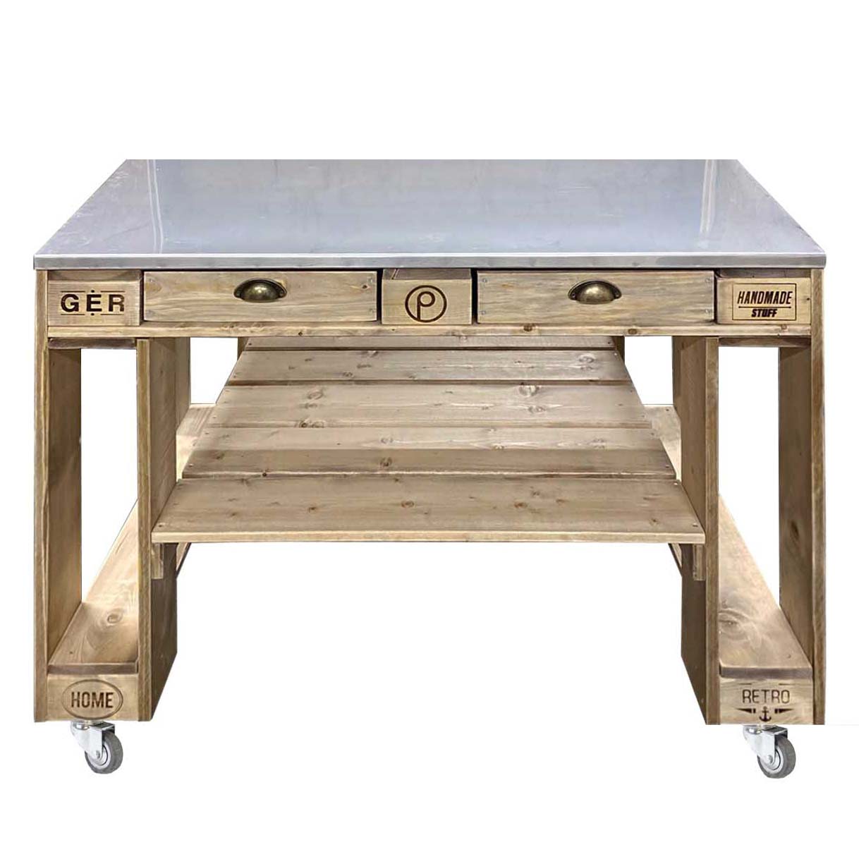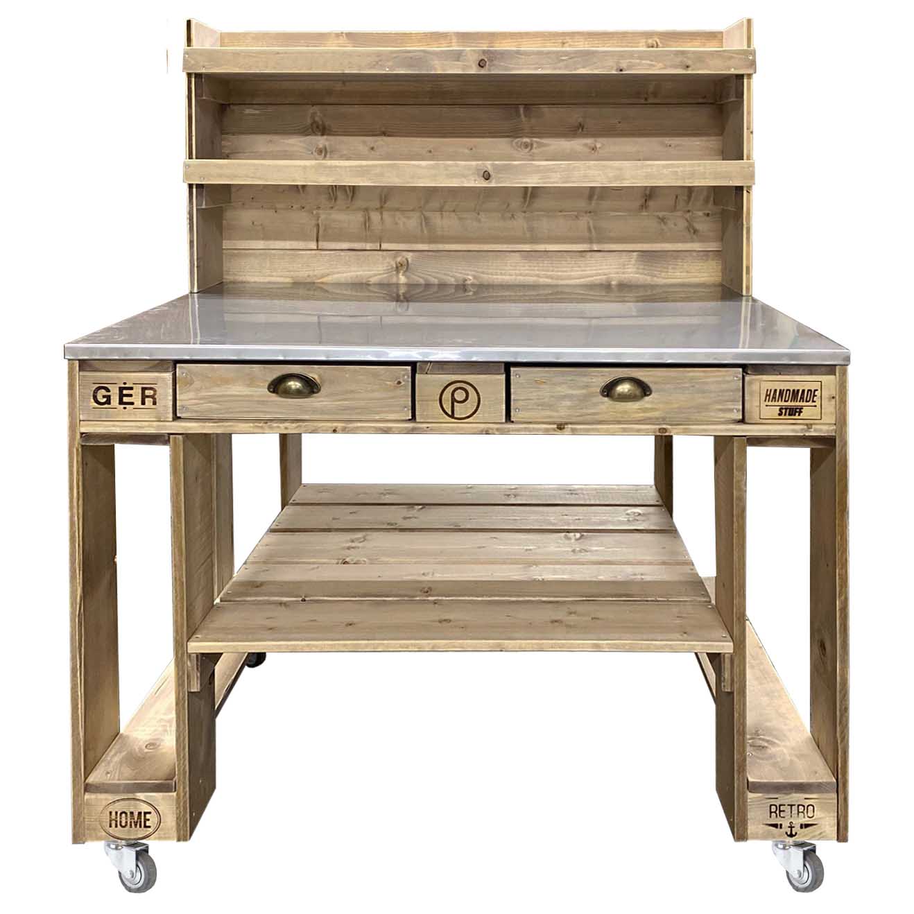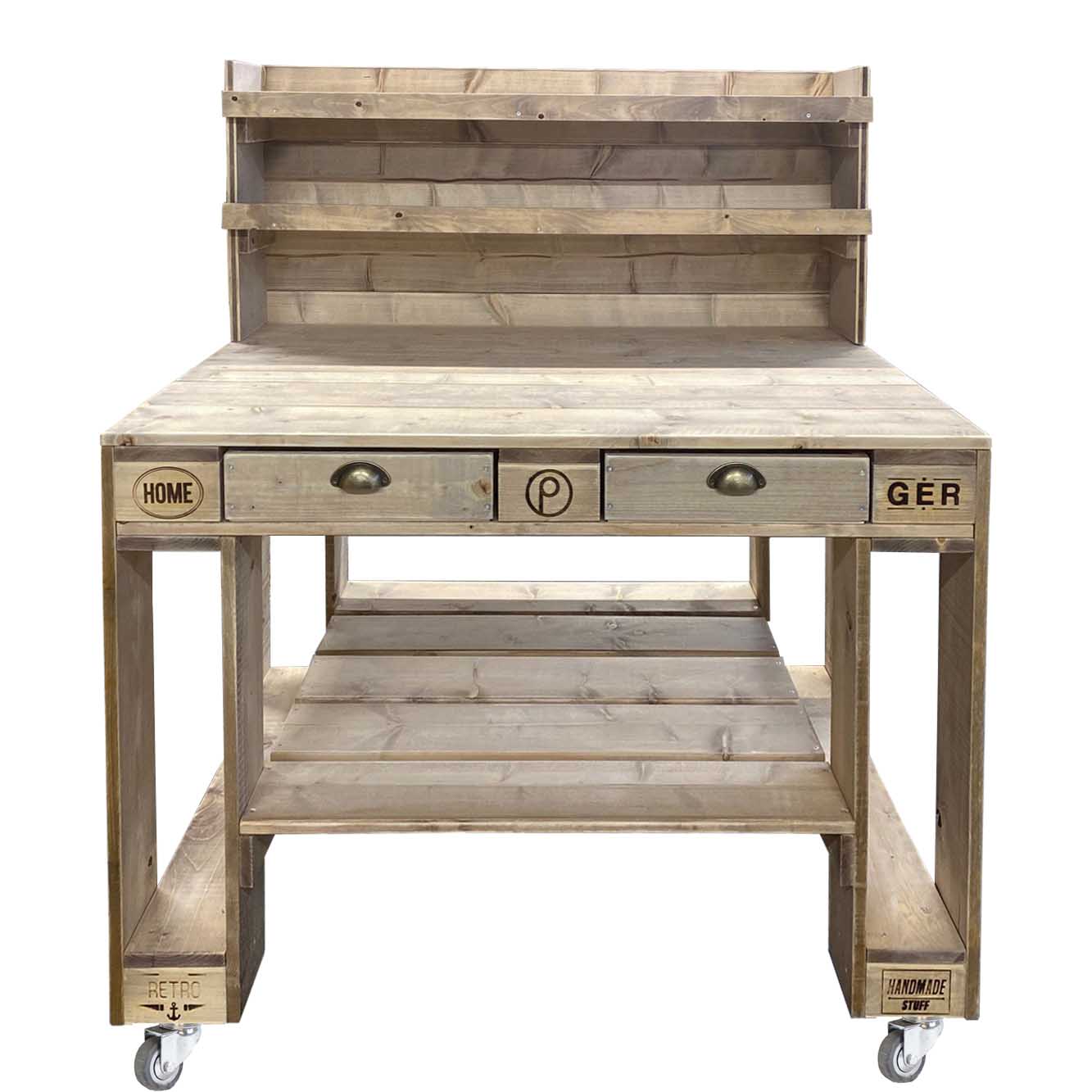 Grilltisch - Kücheninsel - Grillwagen - Outdoorküche im typischen Palettenmöbel Design Dieser funktionelle Grilltisch aus Neuholz lässt jedes Grillmeister-Herz höher schlagen.Sie werden Ihre Freude an diesem Grilltisch im Paletten Look haben, egal ob auf Terrasse, Balkon oder Garten. Viele praktische Detailsmachen diesen Palettentisch zu einem echten Schmuckstück.Die in die Tischplatte eingelassene Arbeitsfläche aus Feinsteinzeug erlaubt eine leichte Reinigung.4 seitliche Ablagen mit Rahmen sowie eine mittige Ablage schaffen reichlich Platz für Saucen, Gewürze oder Zubehör. 2 Schubladen bieten zusätzlichen Stauraum.Ausgestattet mit 4 Schwerlast-Rollen (2 davon mit Stopp-Funktion) wird dieser Palettenmöbel Grilltisch auch zum Grillwagen, und last sich mühelos an den gewünschten Standort transportieren.Varianten: "PREMIUM" mit Feinsteinzeug Einlage "PREMIUM" mit Edelstahl Arbeitsfläche "PREMIUM" mit Rückwand Regal u. Feinsteinzeug Einlage "PREMIUM" mit Rückwand Regal u. Arbeitsfläche Edelstahl Maße: Breite: 120 cm Tiefe: 80 cm Höhe: 91 cm (incl. Rollen) Gewicht: 63 KgMaße, Gewicht und Farbgebung können materialbedingt minimal abweichen Material: Neuholz Kiefer / Fichte, Standard Auslieferung in Vintage gebeizt unbehandelt natur gerne auf AnfrageTischplatte: 3-Schichten Tischlerplatte mit Bootslack eingelassenAuf Wunsch auch mit neutralen Klötzen ohne Branding Eigenschaften: Massiv gebauter Grilltisch / Grillwagen 2 Schubladen mit Muschelgriff 1 mittiges Abstellfach 83,5 x 80 cm, seitlich je 2 Abstellfächer mit Rahmen 2 Doppelhakenleisten Edelstahl 4 Schwerlastrollen (davon 2 mit Feststeller)OPTIONAL: passgenaue Abdeckhaube (siehe Zubehör)Lieferzustand: Originalverpackt & Neu Artikel wird fertig montiert geliefert (Ausnahme: Rollen und Doppelhakenleiste) Dekorationen im Lieferumfang nicht enthaltenVersand: Versandkosten (nach Volumen / Gewicht) sind im jeweiligen Warenkorb ersichtlich Versand auf Inseln und ins Ausland nur auf Anfrage