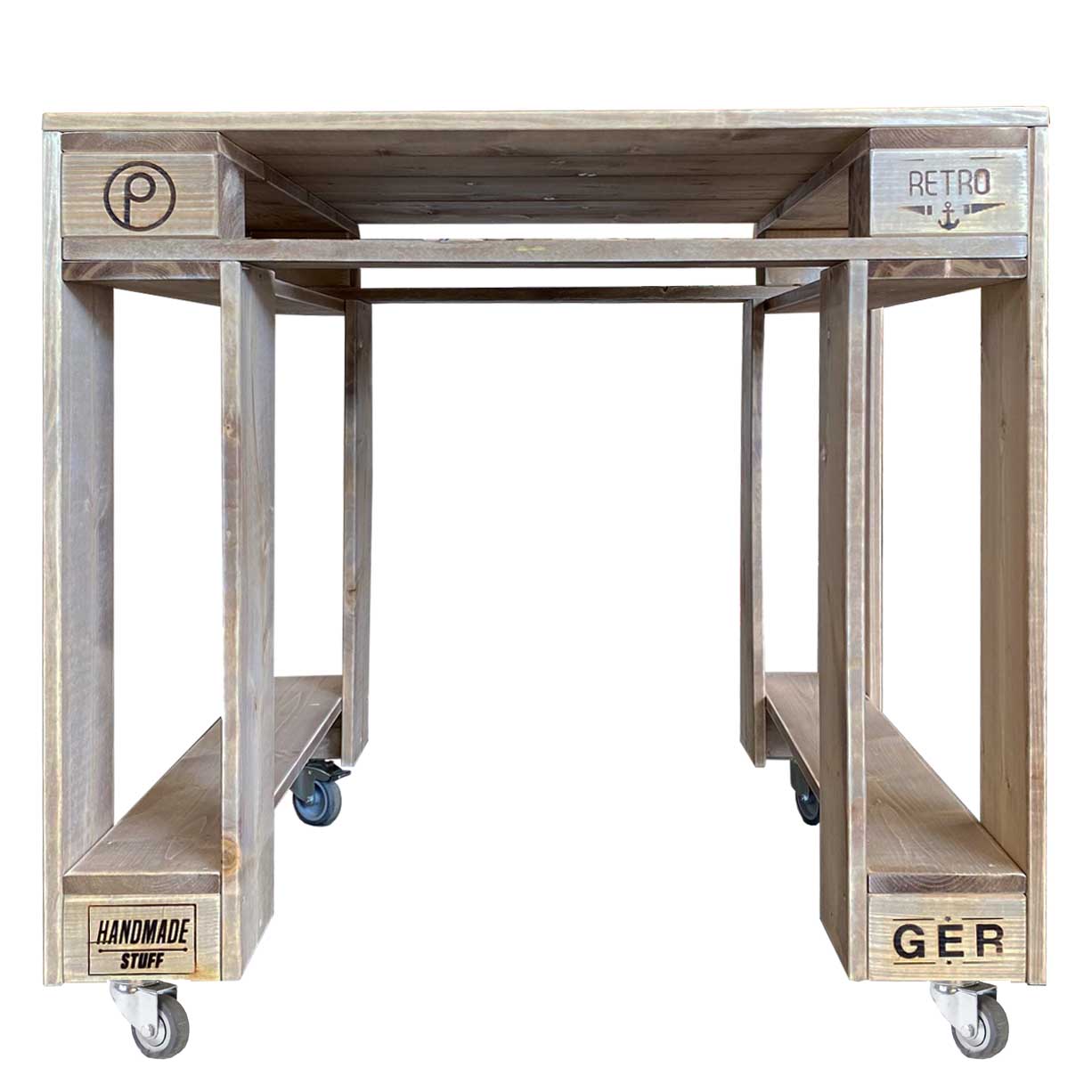 Dank der mitgelieferten Lenkrollen wird dieser Tisch aus Paletten Neuholz auch zu einem Grillwagen, leicht von A nach B zu transportieren.