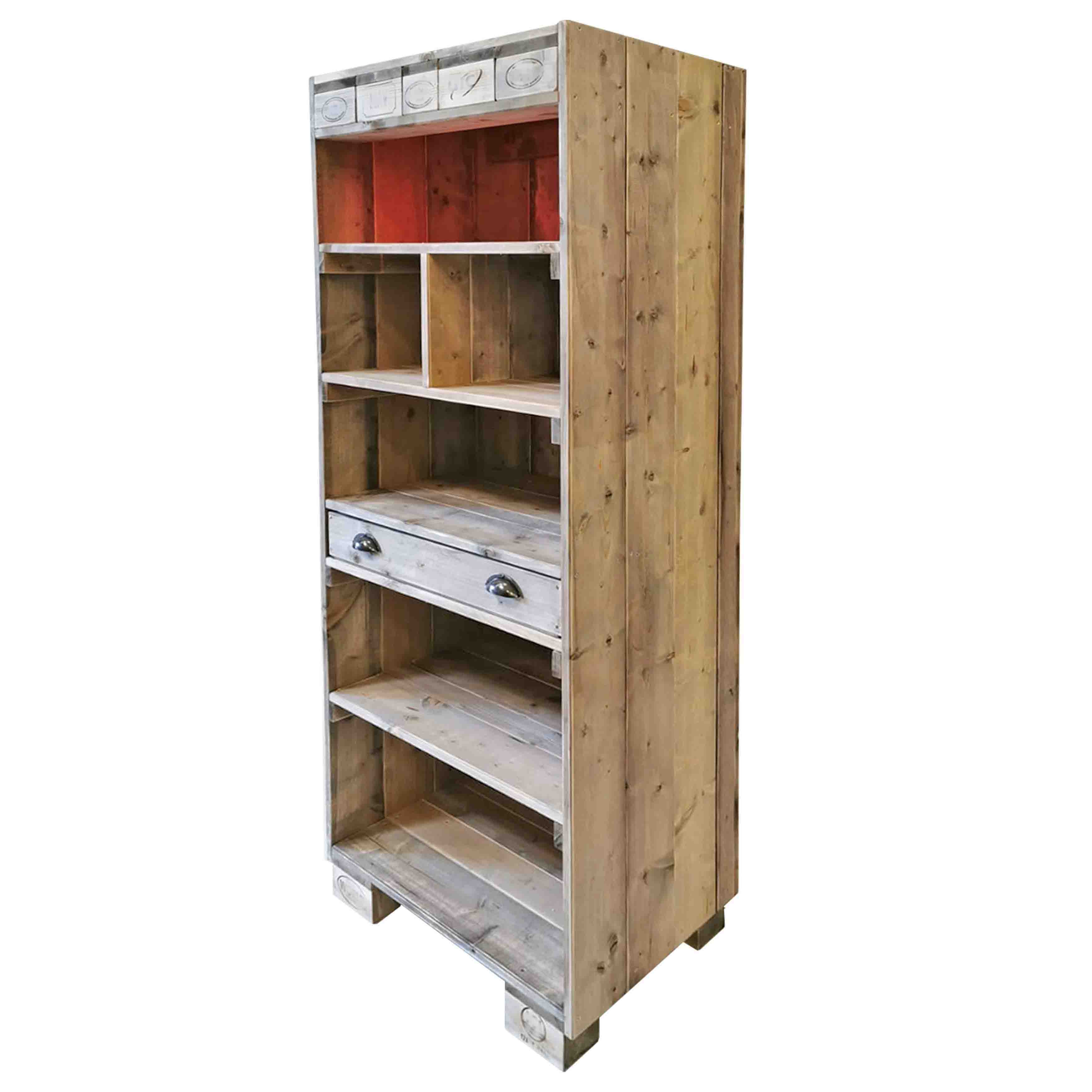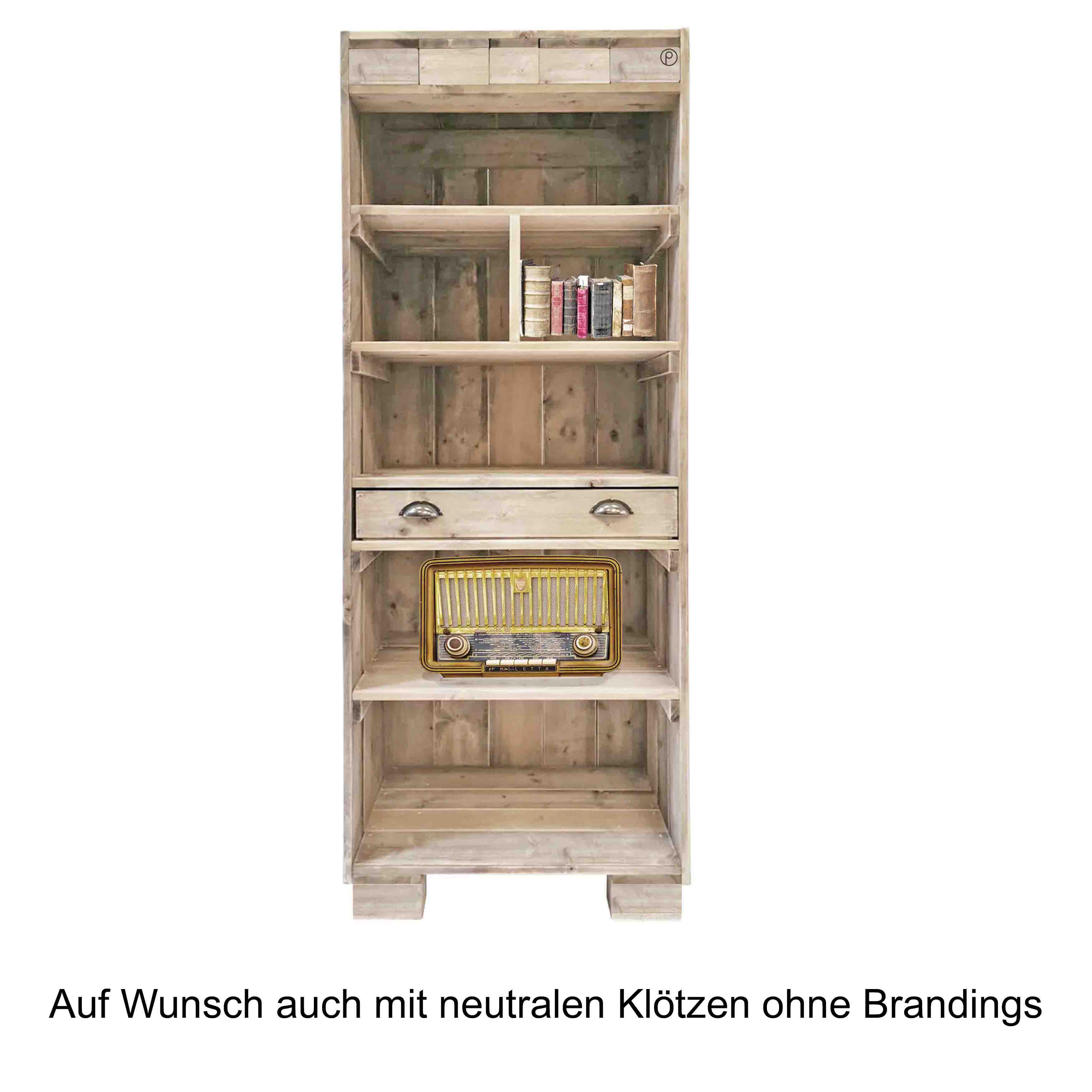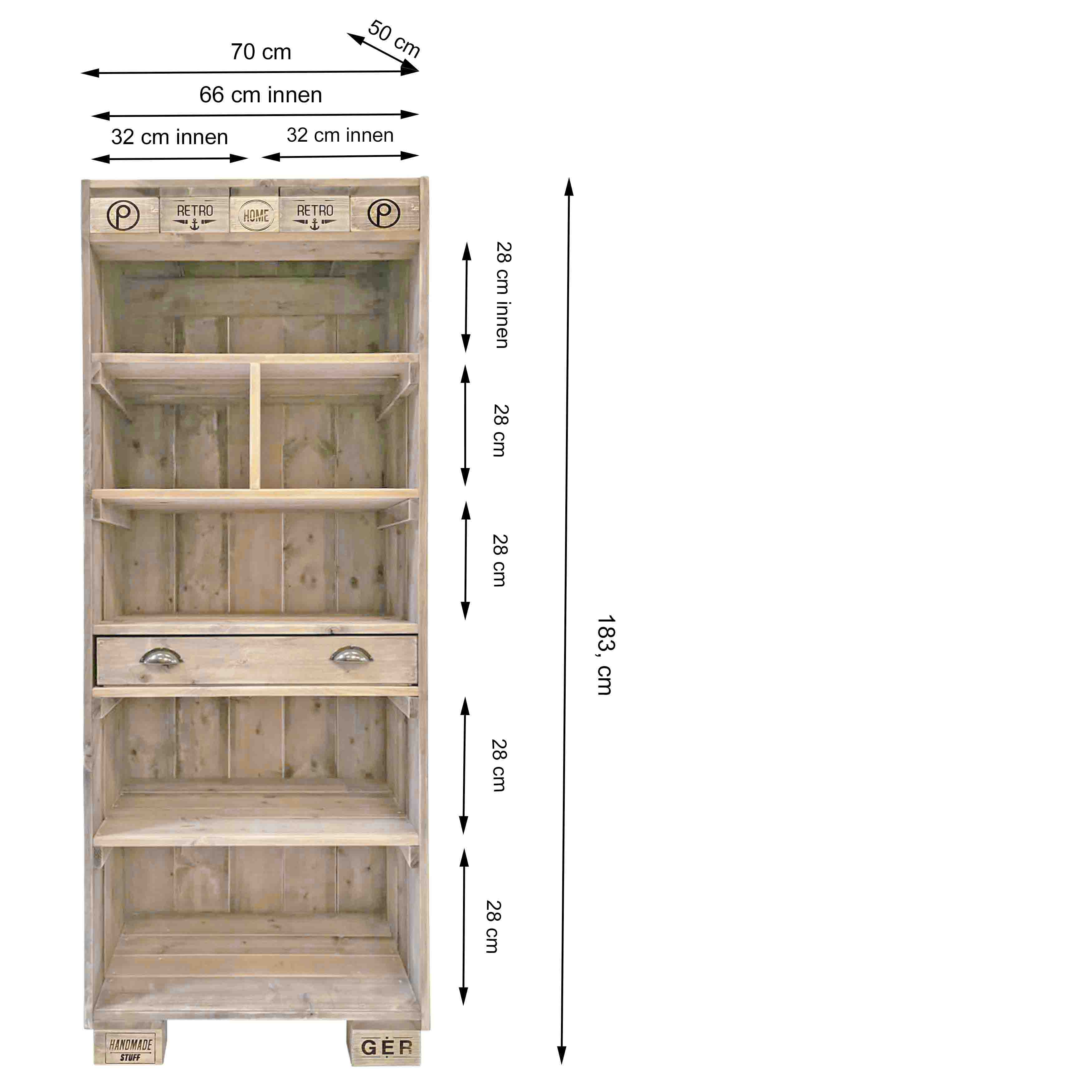 PALETTENMÖBEL: hochwertig und massiv gebauter Hoch-Schrank aus Neuholz im typischen Paletten Design Maße: Breite: 60 cm Tiefe: 42 cm Höhe: 178 cm Gewicht: 52 Kg (Maße, Gewicht und Farbgebung können materialbedingt minimal abweichen) Material: Neuholz Kiefer / Fichte, Standard Auslieferung in Vintage gebeizt Unbehandelt natur gerne auf AnfrageAuf Wunsch auch mit neutralen Klötzen ohne Branding Eigenschaften: 2 große Ablagen (B 56, T 40, H 43 cm) 1 kleine Ablage (B 28, T 40, H 11 cm) 1 kleines Schubfach (B 28, H 11, T 40 cm) 1 Tür an Softclose Scharnieren (Innenraum B 56, T 38, H 50 cm) Lieferzustand: Originalverpackt & Neu Artikel wird fertig montiert geliefert Dekorationen im Lieferumfang nicht enthalten Versand:Versandkosten (nach Volumen / Gewicht) sind im jeweiligen Warenkorb ersichtlichVersand auf Inseln und ins Ausland nur auf Anfrage