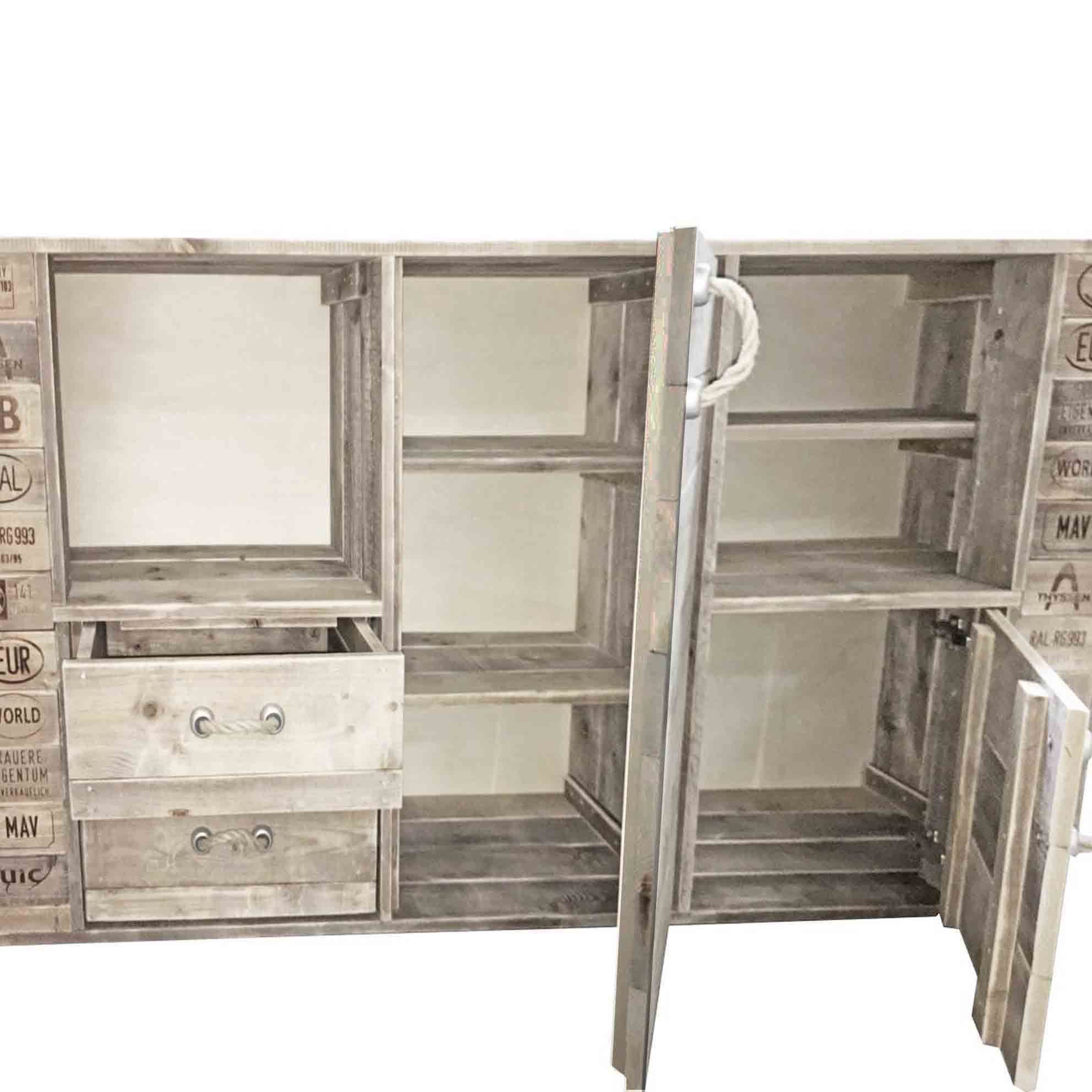 - Links: 2 Schubladen unten mit Seilgriff, darüber 1 großes, offenes Fach