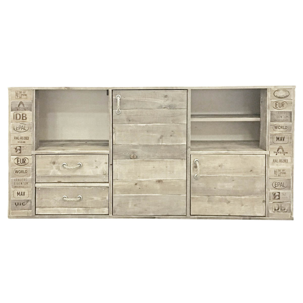 Das große Highboard WAINAKU kombiniert natürlichen Charme, massives Paletten Neuholz und großzügigen Stauraum zu einem stilvollen Möbelstück für jeden Wohnbereich. Gefertigt in aufwendiger Handarbeit besticht WAINAKU durch seine robuste Konstruktion, markante Holzstruktur und vielseitige Einsatzmöglichkeiten.Das Highboard bietet viel Platz für Geschirr, Bücher, Wohnaccessoires oder persönliche Gegenstände und wird so zum funktionalen Highlight im Wohnzimmer, Esszimmer, Büro oder Flur. Die charakteristische Palettenoptik verleiht dem Möbelstück eine warme, rustikale und dennoch moderne Ausstrahlung – ideal für Liebhaber von Upcycling-Möbeln und nachhaltigem Wohnen.Dank der sorgfältigen Verarbeitung bleibt das Highboard langlebig, stabil und optisch ansprechend. Jede Oberfläche wird mehrfach geschliffen und behandelt, damit das Holz seine natürliche Maserung behält und gleichzeitig widerstandsfähig bleibt. Maße: Breite: 198 cm Tiefe: 40 cm Höhe: 84 cm Gewicht: 59 Kg (Maße, Farbton und Gewicht können materialbedingt minimal abweichen) Material: Neuholz Kiefer / Fichte, Standard Auslieferung in Vintage gebeizt unbehandelt-natur gerne auf Anfrage)Auf Wunsch auch mit neutralen Klötzen ohne Branding Eigenschaften: 3 offene Ablagen jeweils B= 55 cm, H 37 cm, T 38 cm 3 Türen mit Seilgriffen, Innenmaß jeweils B= 55 cm, H 37 cm, T 36 cm Lieferzustand: Originalverpackt & Neu Artikel wird fertig montiert geliefert Dekorationen im Lieferumfang nicht enthalten Versand: Versandkosten (nach Volumen / Gewicht) sind im jeweiligen Warenkorb ersichtlich Versand auf Inseln und ins Ausland nur auf Anfrage