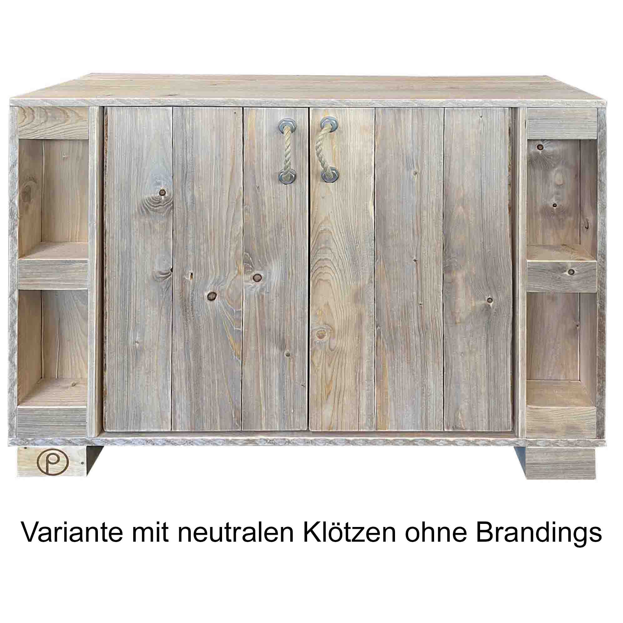 Palettenmöbel - Sehr aufwendig und massiv gebaute Kommode / Highboard aus Neuholz gefertigt im typischen Paletten Design. Maße: Breite: 120 cm Tiefe: 40 cm Höhe: 96 cm Gewicht: 74 Kg Maße, Gewicht und Farbgebung können materialbedingt minimal abweichen Material: Neuholz Kiefer / Fichte, Standard Auslieferung in Vintage gebeiztunbehandelt natur gerne auf Anfrage)Auf Wunsch auch mit neutralen Klötzen ohne Branding Eigenschaften: Massiv gebautes Highboard mit 36 verbauten Vollholzklötzen 2-teilige Lieferung ermöglicht variable Aufstellung Set bestehend aus 2 Teilen und kann nach Wunsch gestapelt werden 4 große, 2 kleine Schubfächer mit Seilgriffen (Innenmaß groß 86 cm, klein 34cm) 3 Front-Ablagen, seitlich je 8 Ablagefächer Lieferzustand: Originalverpackt & Neu Artikel wird fertig montiert geliefert Dekorationen im Lieferumfang nicht enthalten Versand:Versandkosten (nach Volumen / Gewicht) sind im jeweiligen Warenkorb ersichtlichVersand auf Inseln und ins Ausland nur auf Anfrage