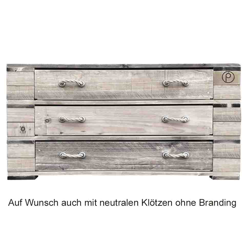 Palettenmöbel: massive Kommode- Sideboard aus Neuholz mit 24 verbauten Vollholz-Klötzen in typischer Paletten Optik.