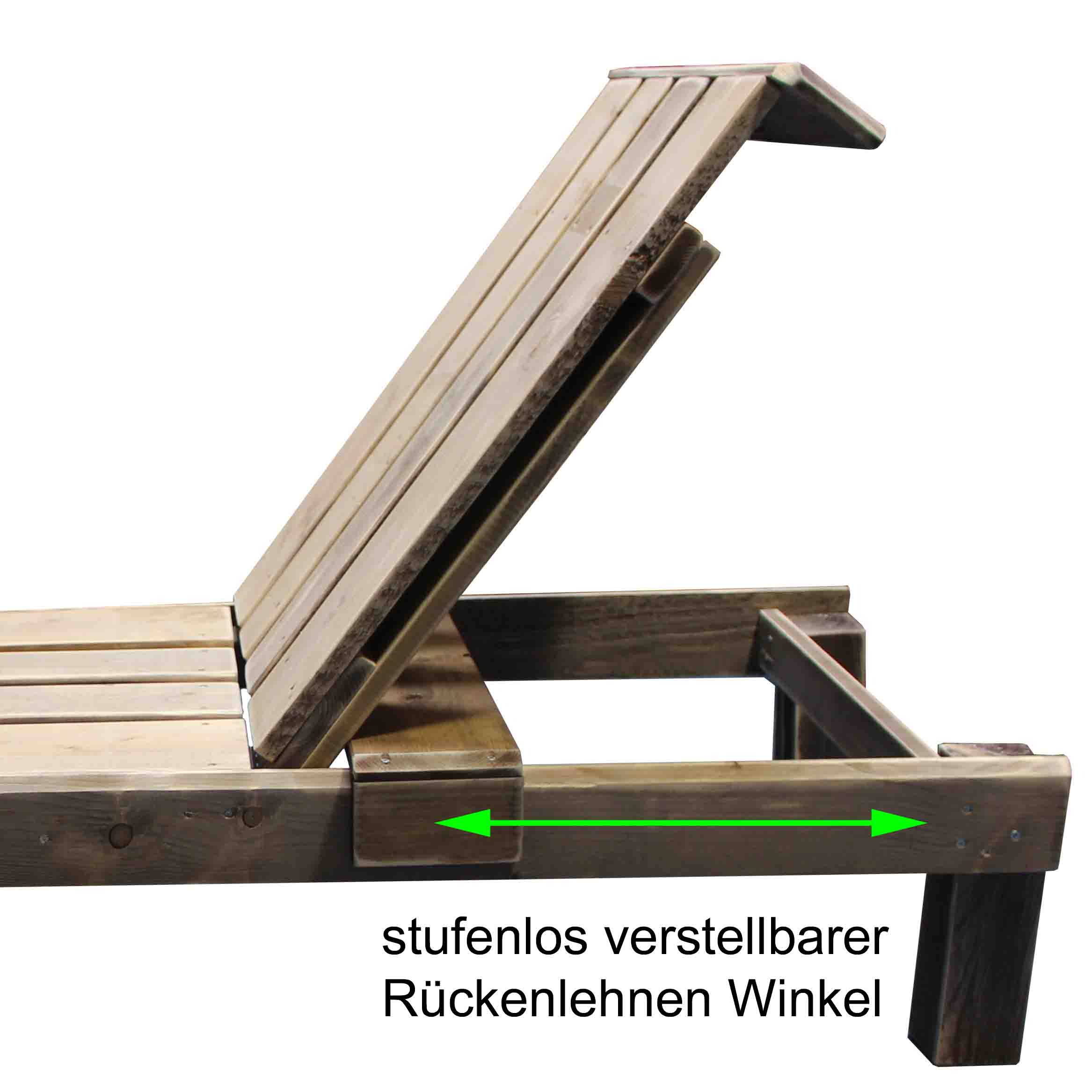 Palettenmöbel: Stabil gebaute Sonnenliege / Gartenliege / Lounge-Liege mit verstellbarem Kopfteil im typischen Paletten Design Maße: Breite: 63 cm Tiefe:194 cm Höhe: 25 cm Gewicht:39 Kg (Maße, Gewicht und Farbgebung können materialbedingt minimal abweichen)Material:Neuholz Kiefer / Fichte, Standard Auslieferung in Vintage gebeizt unbehandelt natur gerne auf AnfrageGerne auch mit neutralen Klötzen ohne BrandingEigenschaften: Preisvorteil im 2-er Set (siehe Varianten) erhältlich auch mit Seitenteil "Kalama-Side" (siehe Varianten) Belastbarkeit 120 kg Lieferzustand: Originalverpackt & Neu Artikel wird fertig montiert geliefert Dekorationen im Lieferumfang nicht enthalten Versand:Versandkosten (nach Volumen / Gewicht) sind im jeweiligen Warenkorb ersichtlichVersand auf Inseln und ins Ausland nur auf Anfrage