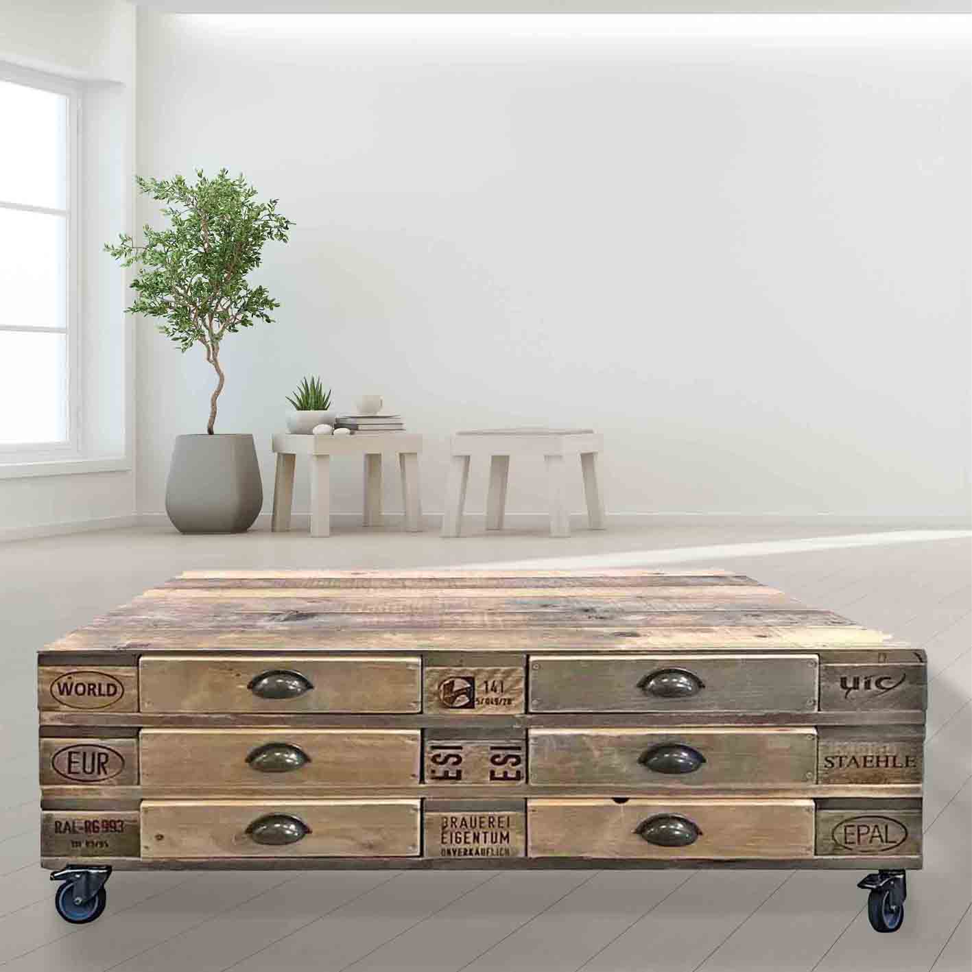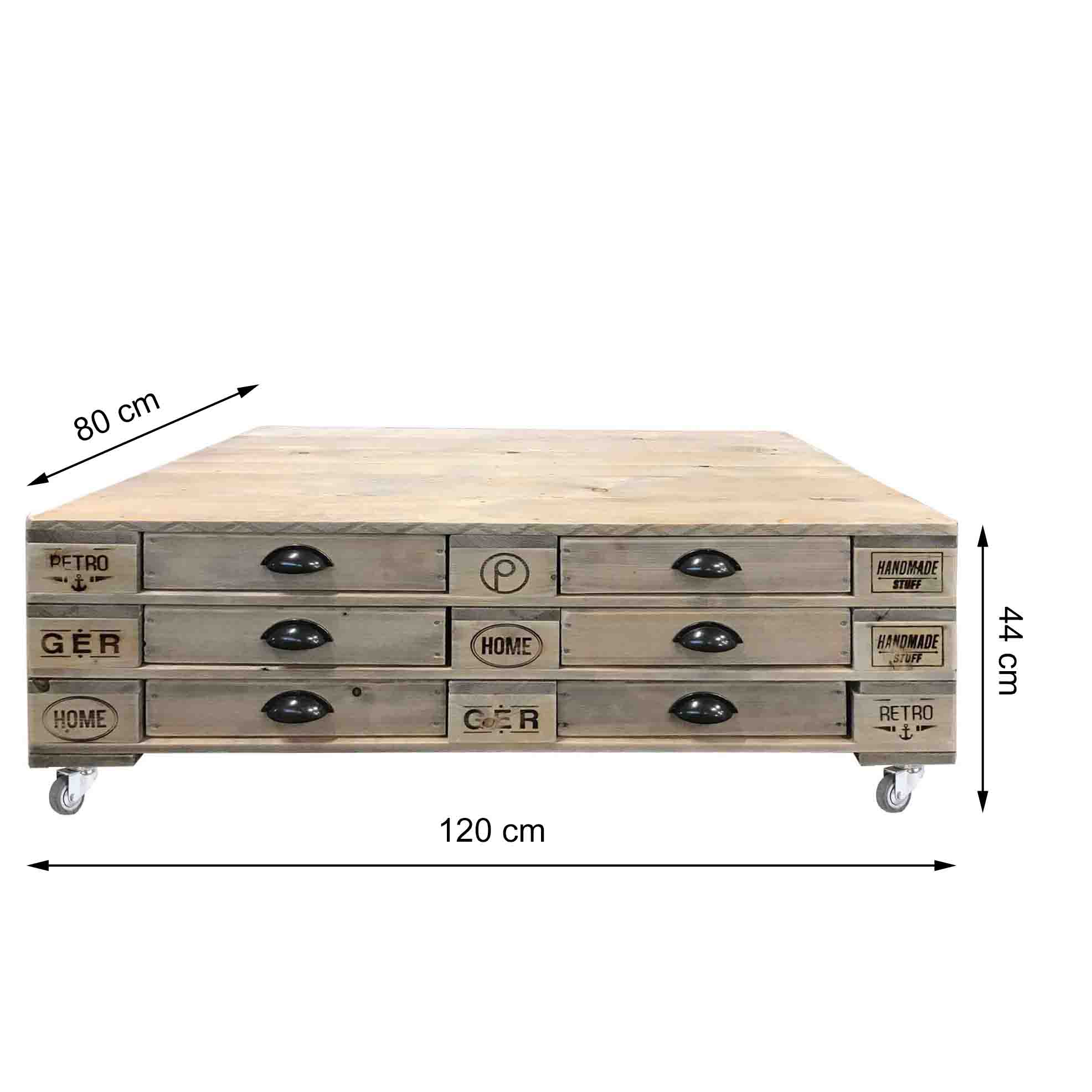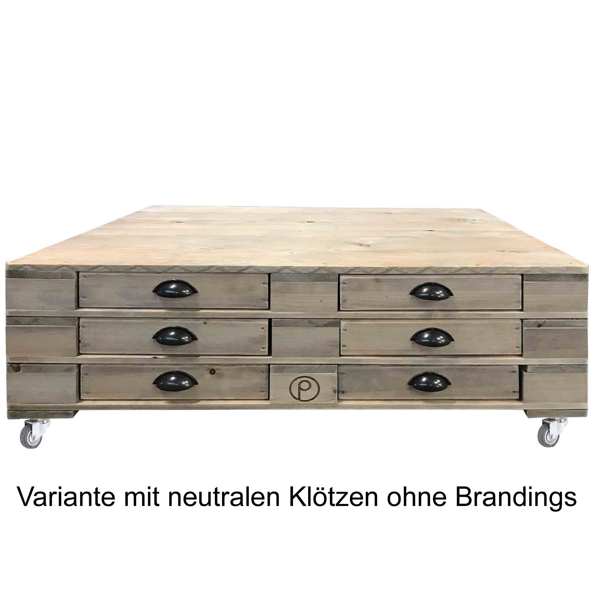 Palettenmöbel: Wohnzimmertisch, Couchtisch - massiver, großer Tisch aus Neuholz mit Glasplatte im typischen Paletten Design. Maße: Breite: 120 cm Tiefe: 80 cm Höhe: 47 cm Gewicht: 71 KgMaße, Gewicht und Farbgebung können materialbedingt minimal abweichen Material: Neuholz Kiefer / Fichte, Standard Auslieferung in Vintage gebeizt unbehandelt natur gerne auf AnfrageAuf Wunsch auch mit neutralen Klötzen ohne Branding Eigenschaften: Tischplatte aus Verbundsicherheitsglas "ESG" 8mm stark 8 Schubladen, beidseitig je 4 ( ca. 40 x 40 x 8,5) je 2 Ablagefächer an beiden Seiten 21 verbaute Vollholz-Klötze 4 Schwerlastrollen (davon 2 mit Feststellfunktion) Lieferzustand: Originalverpackt & Neu Artikel wird fertig montiert geliefert ( Ausnahme: Rollen liegen transportbedingt bei ) Dekorationen im Lieferumfang nicht enthalten Versand: Versandkosten (nach Volumen / Gewicht) sind im jeweiligen Warenkorb ersichtlich Versand auf Inseln und ins Ausland nur auf Anfrage