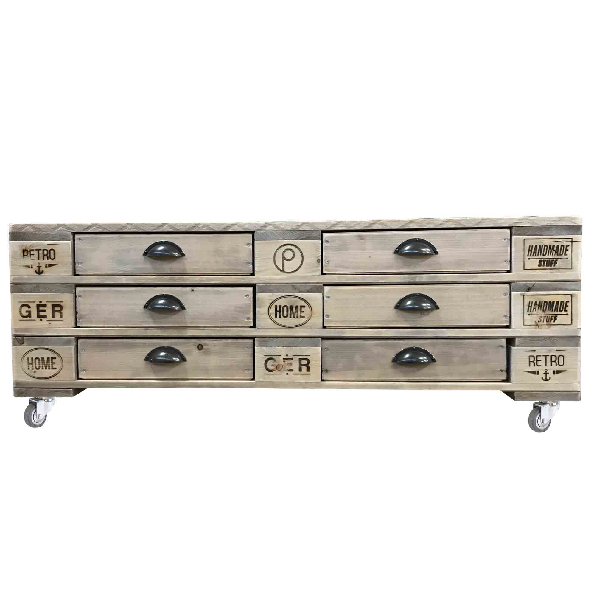 Große Kommode - Highboard, massiv gebaut mit 8 durchgehenden Schubladen in typischer Paletten Optik. Maße: Breite: 120 cm Tiefe: 80 cm Höhe: 61 cm Gewicht: 55 KgMaße, Gewicht und Farbgebung können materialbedingt minimal abweichen Material: Neuholz Kiefer / Fichte, Standard Auslieferung in Vintage gebeizt gerne auch unbehandelt naturAuf Wunsch auch mit neutralen Klötzen ohne Branding Eigenschaften: 8 durchgehende Schubladen (ca 80 cm) mit Muschelgriffen, von beiden Seiten zu öffnen je 2 Ablagefächer an beiden Seiten 4 Schwerlastrollen (davon 2 mit Feststellfunktion) Lieferzustand: Originalverpackt & Neu Artikel wird fertig montiert geliefert ( Ausnahme: Rollen liegen transportbedingt bei ) Dekorationen im Lieferumfang nicht enthalten Versand: Versandkosten (nach Volumen / Gewicht) sind im jeweiligen Warenkorb ersichtlich Versand auf Inseln und ins Ausland nur auf Anfrage