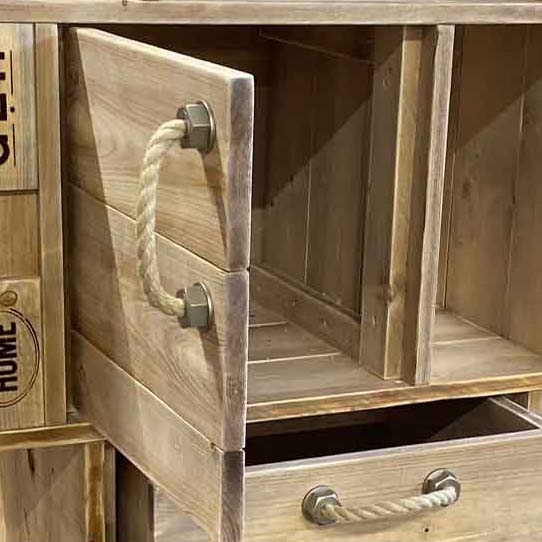 Dieser Blickfang im typischen Paletten Style besitzt zwei Stauräume hinter Türen sowie ein Schubfach, jeweils mit Seilgriffen versehen.