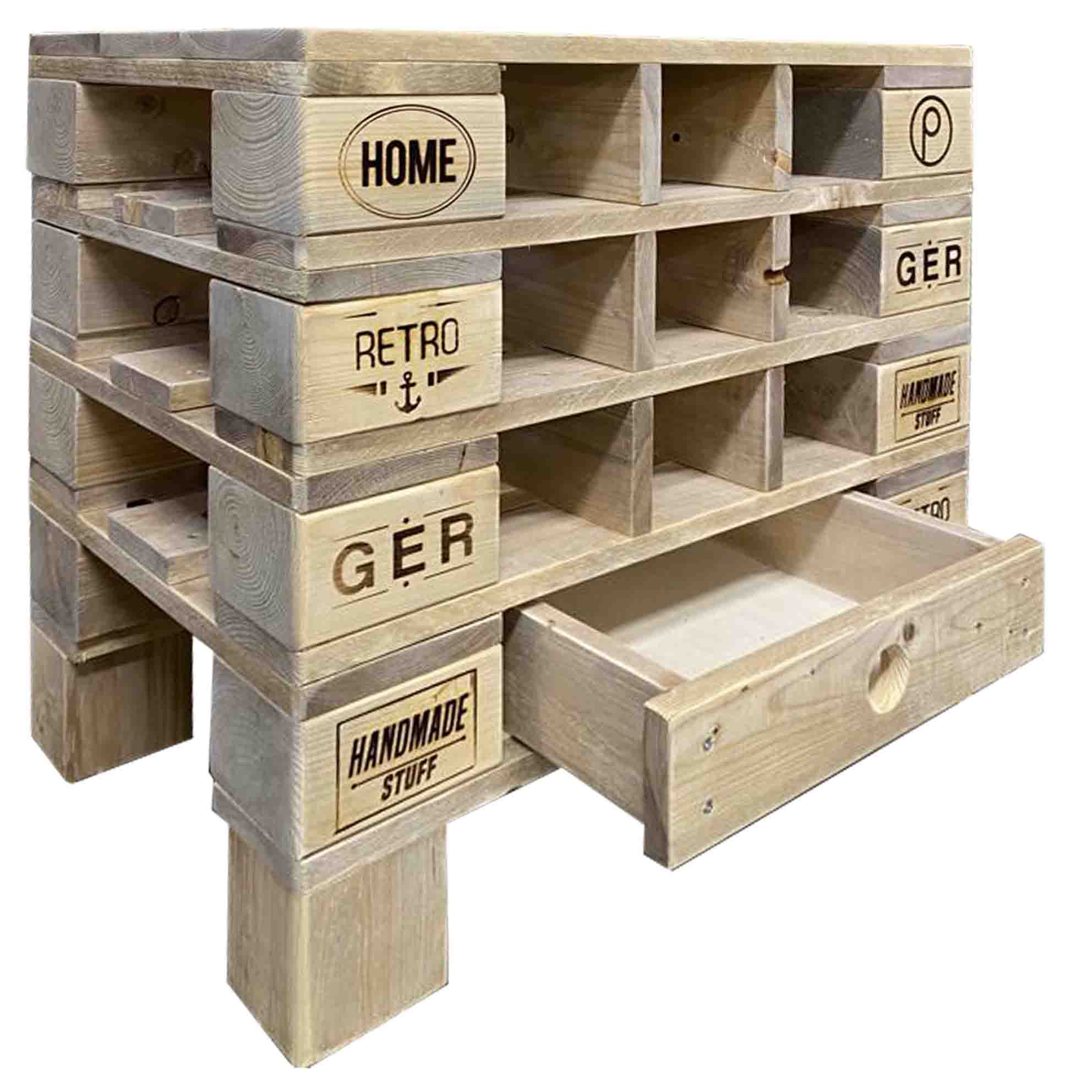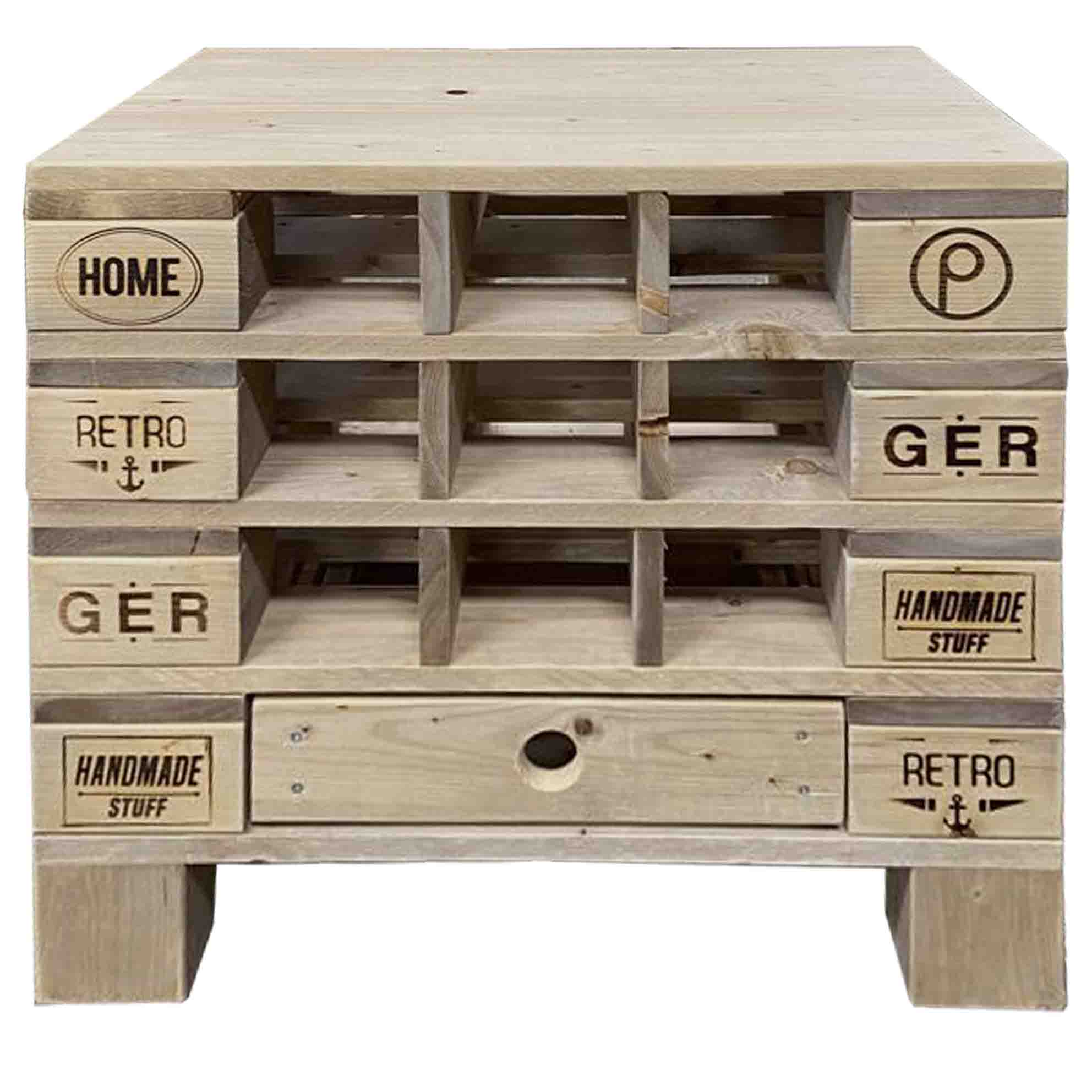 Palettenmöbel: Wein-Kommode, Wein-Schrank aus Neuholz in klassischer Paletten Optik vintage gebeizt, mit 36 verbauten Klötzen Maße: Breite: 67 cm Tiefe: 40 cm Höhe: 106 cm Gewicht: 52 Kg (Maße, Gewicht und Farbgebung können materialbedingt minimal abweichen) Material: Neuholz Kiefer / Fichte, Standard Auslieferung in Vintage gebeizt (farblos-natur gerne auf Anfrage)Auf Wunsch auch mit neutralen Klötzen ohne Branding Eigenschaften: 18 Flaschenfächer 2 Schubladen Lieferzustand: Originalverpackt & Neu Artikel wird in 2 Teilen geliefert Dekorationen im Lieferumfang nicht enthaltenWir fertigen Ihnen auch gerne Ihr Wunschmaß an Versand: Versandkosten (nach Volumen / Gewicht) sind im jeweiligen Warenkorb ersichtlich Versand auf Inseln und ins Ausland nur auf Anfrage