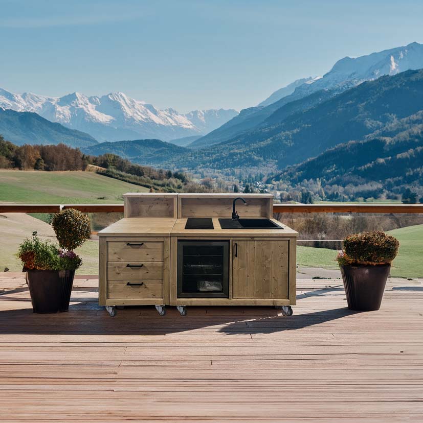 Grilltisch, Outdoorküche, Kücheninsel in Paletten Optik aus Neuholz gefertigt. Dieses Grilltisch Modul auf 100 cm Breite ist mit einem Edelstahl Spülbecken und Mischbatterie ausgestattet.Dank der mitgelieferten Lenkrollen ist dieser Tisch im Paletten Design leicht von A nach B zu transportieren.Für unsere Grilltische der PERTHONE Serie dient er perfekt als Erweiterungs-Modul.Maße: Breite: 100 cm Tiefe: 80 cm Höhe: 91 cm (incl. Rollen)Maße, Gewicht und Farbgebung können materialbedingt minimal abweichen Material: Neuholz Kiefer / Fichte, Standard Auslieferung in Vintage gebeizt Gerne auch unbehandelt naturAuf Wunsch auch mit neutralen Klötzen ohne Branding Eigenschaften: Massiv gebautes Outdoorküchen Modul Front Türe mit Softclose Scharnieren seitlich je 1 Fachboden 4 Schwerlastrollen (davon 2 mit Feststeller) Perfekt als Ergänzung zu allen Grilltischen der PERTHONE SerieOPTIONAL: passgenaue Abdeckhaube (siehe Zubehör) Einbauspülbecken: B: 60,5 T: 50 cm Edelstahl Mischbatterie Lieferzustand: Originalverpackt & Neu Artikel wird fertig montiert geliefert (Ausnahme: Rollen liegen transportbedingt bei) Dekorationen im Lieferumfang nicht enthalten Versand: Versandkosten (nach Volumen / Gewicht) sind im jeweiligen Warenkorb ersichtlich Versand auf Inseln und ins Ausland nur auf Anfrage Elektro-Bauteile sind vor Feuchtigkeit und Witterung zu schützen.Installationshinweis: Der Anschluss an das Stromnetz darf nur durch eine autorisierte Elektrofachkraft erfolgen, die beim örtlichen Energieversorgungsunternehmen zugelassen ist. Nicht autorisierte Personen dürfen keine willkürlichen Veränderungen oder Änderungen an der Elektroinstallation vornehmen. Sanitär-/Wasseranschlüsse sind durch Kunden bzw. einen Fachbetrieb zu erfolgen.