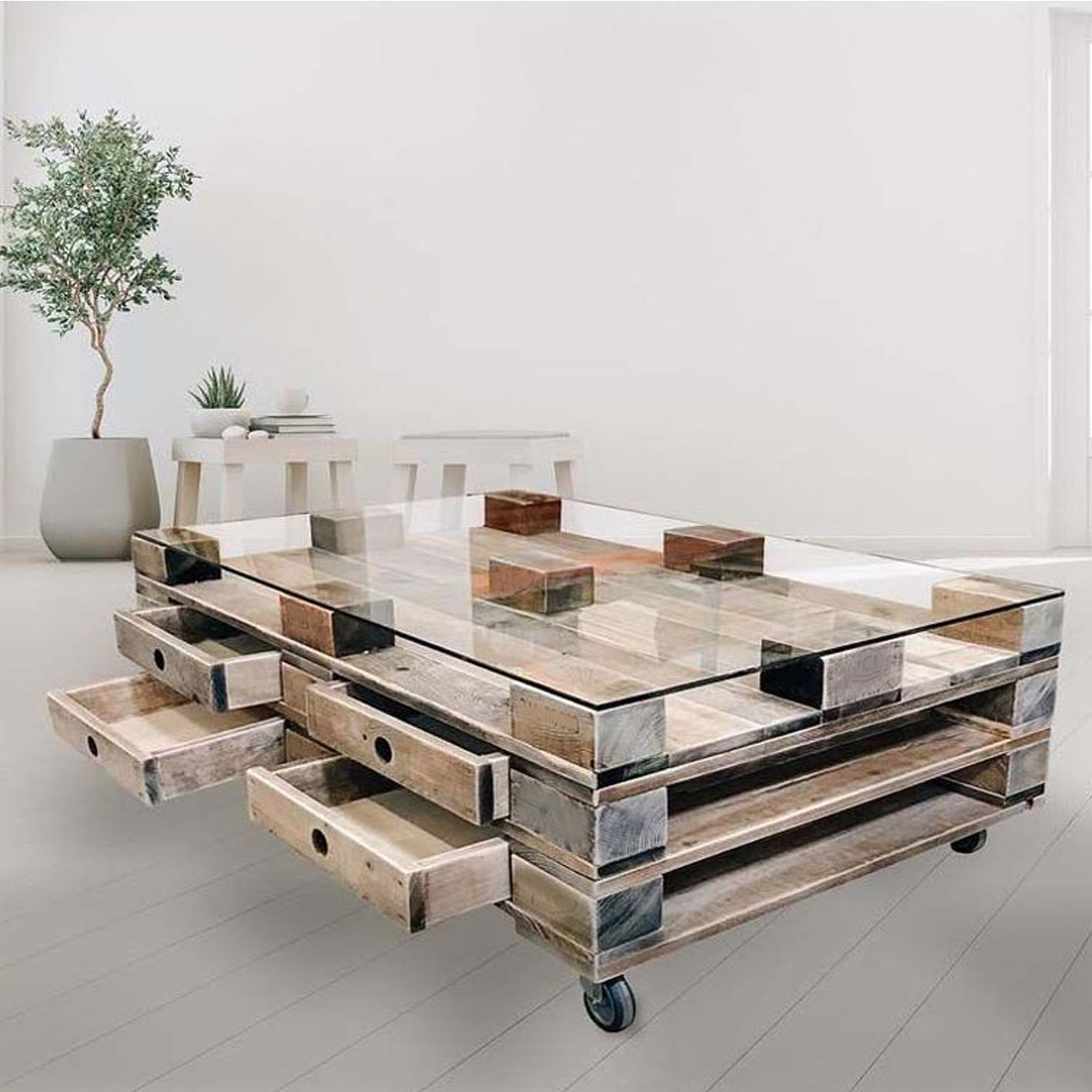 Palettenmöbel: Wohnzimmertisch, Couchtisch - massiver, großer Tisch aus Neuholz mit Glasplatte im typischen Paletten Design. Maße: Breite: 120 cm Tiefe: 80 cm Höhe: 47 cm Gewicht: 71 KgMaße, Gewicht und Farbgebung können materialbedingt minimal abweichen Material: Neuholz Kiefer / Fichte, Standard Auslieferung in Vintage gebeizt unbehandelt natur gerne auf AnfrageAuf Wunsch auch mit neutralen Klötzen ohne Branding Eigenschaften: Tischplatte aus Verbundsicherheitsglas "ESG" 8mm stark 8 Schubladen, beidseitig je 4 ( ca. 40 x 40 x 8,5) je 2 Ablagefächer an beiden Seiten 21 verbaute Vollholz-Klötze 4 Schwerlastrollen (davon 2 mit Feststellfunktion) Lieferzustand: Originalverpackt & Neu Artikel wird fertig montiert geliefert ( Ausnahme: Rollen liegen transportbedingt bei ) Dekorationen im Lieferumfang nicht enthalten Versand: Versandkosten (nach Volumen / Gewicht) sind im jeweiligen Warenkorb ersichtlich Versand auf Inseln und ins Ausland nur auf Anfrage